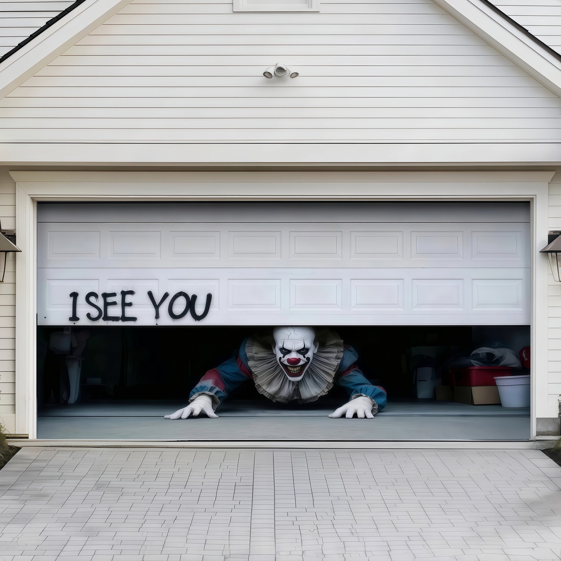 A life-sized nightmare creeping out from under your garage door, daring anyone to come closer. Caught mid-crawl, this killer clown isn’t waiting for an invitation. One glance, and they’ll wish they’d never walked up your driveway.